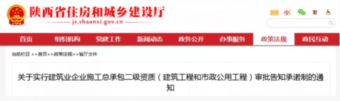 (三)實施范圍。本通知印發(fā)之日起,工商注冊地在陜西的建筑業(yè)企業(yè)建筑工程和市政工程施工總承包二級資質(zhì)實行告知承諾制審批。