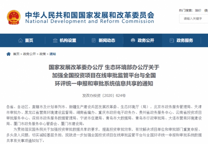 《通知》要求,加強(qiáng)全國投資項目在線審批監(jiān)管平臺與全國環(huán)評統(tǒng)一申報和審批系統(tǒng)數(shù)據(jù)共享。