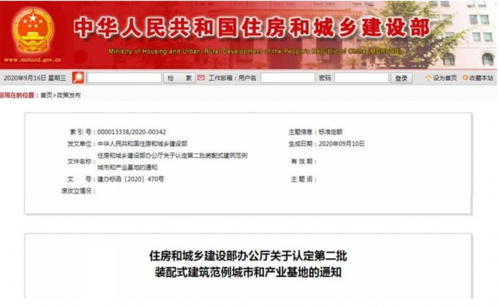 9月15日,住建部認定西安市等18個城市為第二批裝配式建筑范例城市,天津市現(xiàn)代建筑產業(yè)園區(qū)等12個園區(qū)、北京建工集團有限責任公司等121家企業(yè)為第二批裝配式建筑產業(yè)基地。