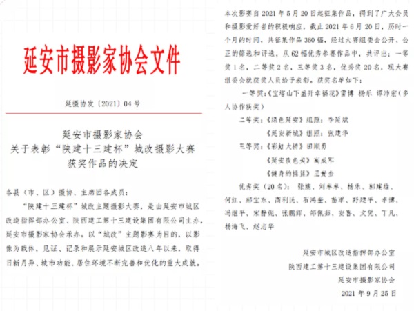 9月29日,由延安市城區(qū)改造指揮部辦公室聯(lián)合陜西建工第十三建設(shè)集團(tuán)有限公司主辦、延安市攝影家協(xié)會承辦的“陜建十三建杯”城改攝影比賽頒獎(jiǎng)儀式暨獲獎(jiǎng)作品展在延安市小東門廣場圣地影像畫廊圓滿舉行。
