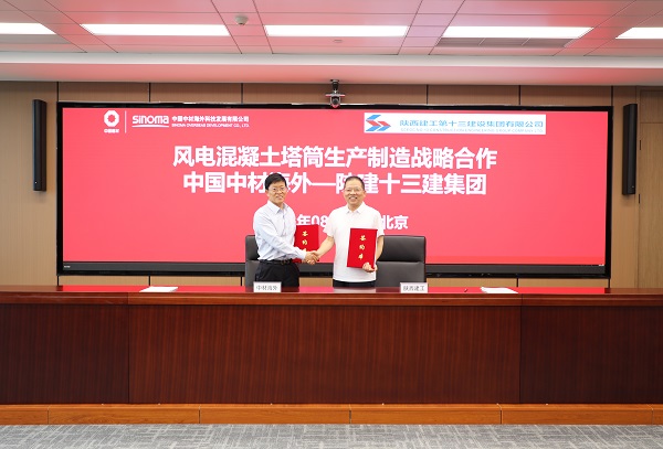 8月1日,集團(tuán)與中國(guó)中材海外科技發(fā)展有限公司在北京就風(fēng)電混凝土塔筒生產(chǎn)制造簽訂戰(zhàn)略合作協(xié)議并簽訂陜西榆林定邊項(xiàng)目混凝土塔筒預(yù)制管片采購(gòu)合同。中國(guó)中材海外科技發(fā)展有限公司黨委書記、執(zhí)行董事高超,集團(tuán)黨委書記、董事長(zhǎng)卜國(guó)平代表雙方簽約并致辭。