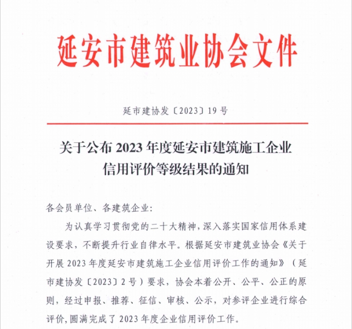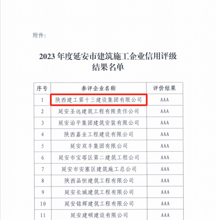 同時(shí),延安市建協(xié)公布了2023年度延安市建筑施工企業(yè)信用評(píng)級(jí)結(jié)果:陜建十三建集團(tuán)被評(píng)為AAA級(jí)企業(yè)。