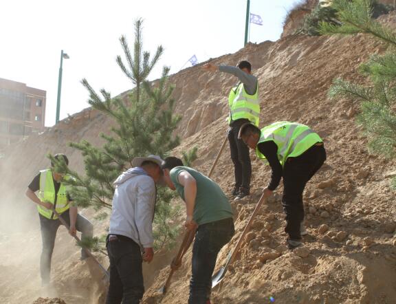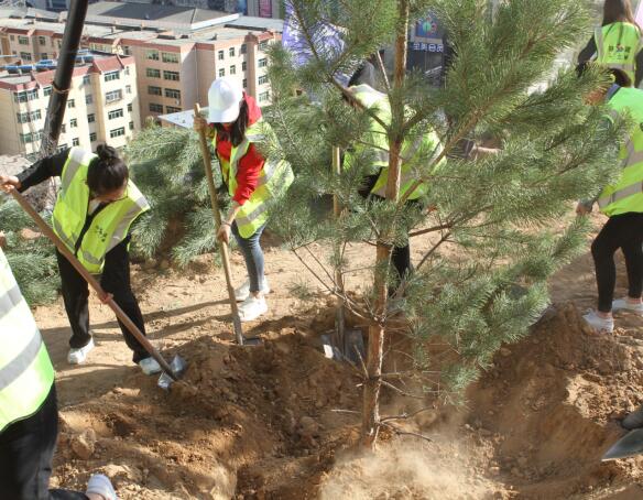 期間,大家互相配合,有的揮鍬鏟土、有的扶樹填土,忙的不亦樂乎。經(jīng)過一個多小時的努力,40多顆松樹在長青路觀景臺“安家落戶”,為那里添上了一片新綠。